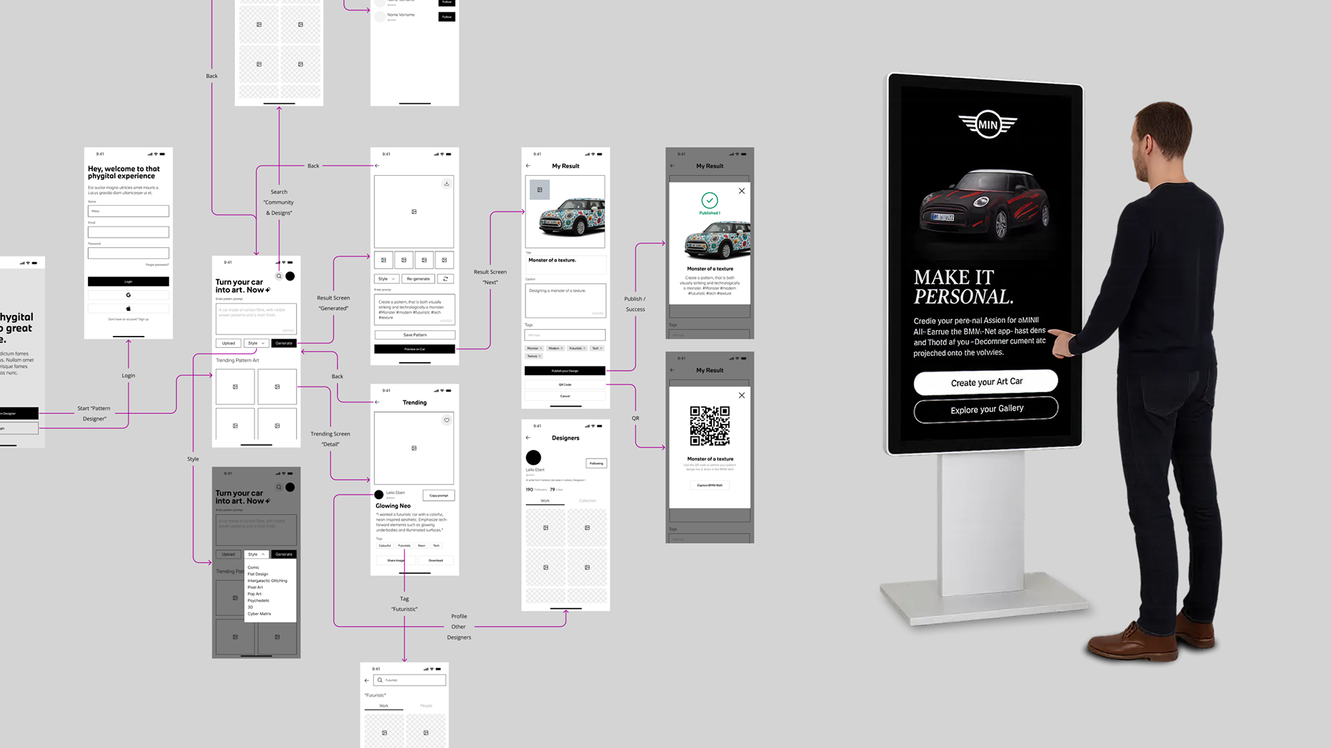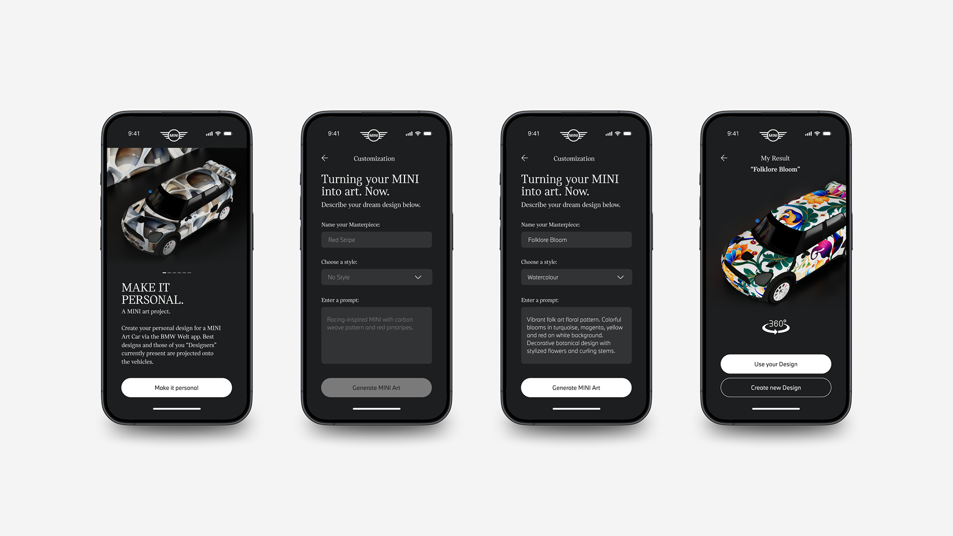 Commissioned by madhat for MINI. Concept and design of a platform enabling visitors to project their creative visions directly onto the physical MINI exhibit. Via Progressive Web App and large-scale touch interfaces in MINI Stores and BMW Welt, users can input their own design prompts and materialize them in real-time on the vehicle – an interactive installation merging digital creation with physical presence across multiple touchpoints.